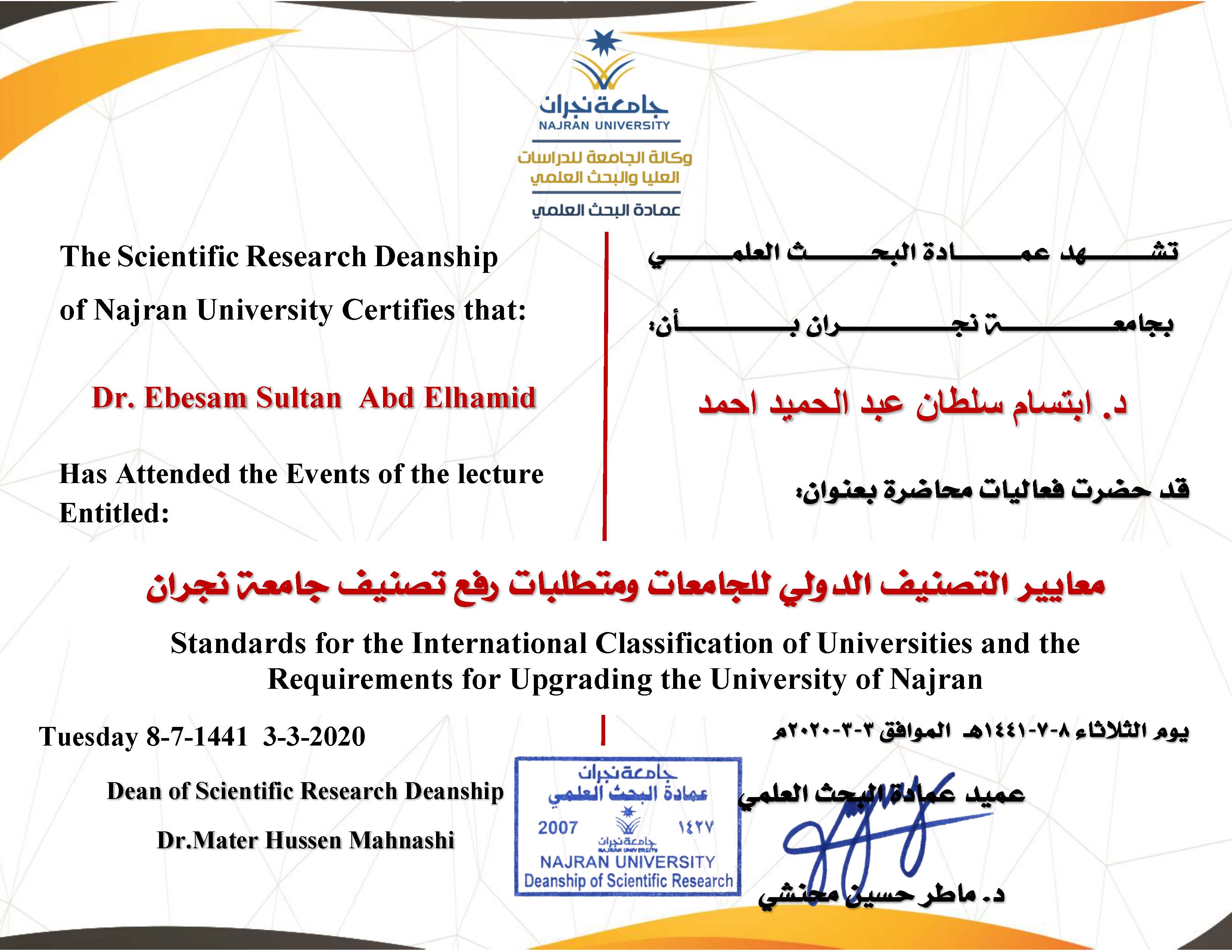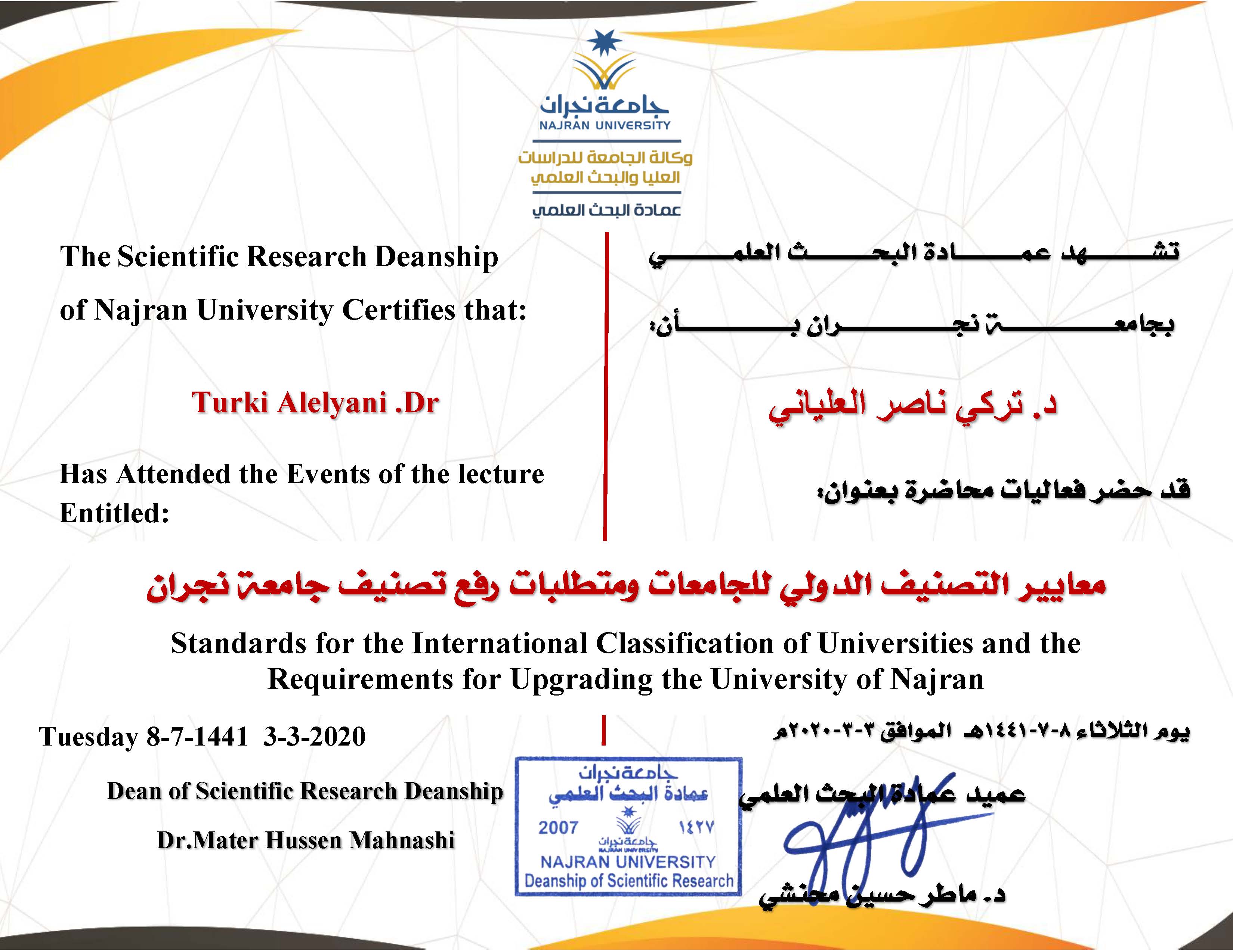 4- المحاضرة العلمية الرابعة معايير التصنيف الدولي للجامعات ومتطلبات رفع تصنيف جامعة نجران - وكالة البحث العلمي
